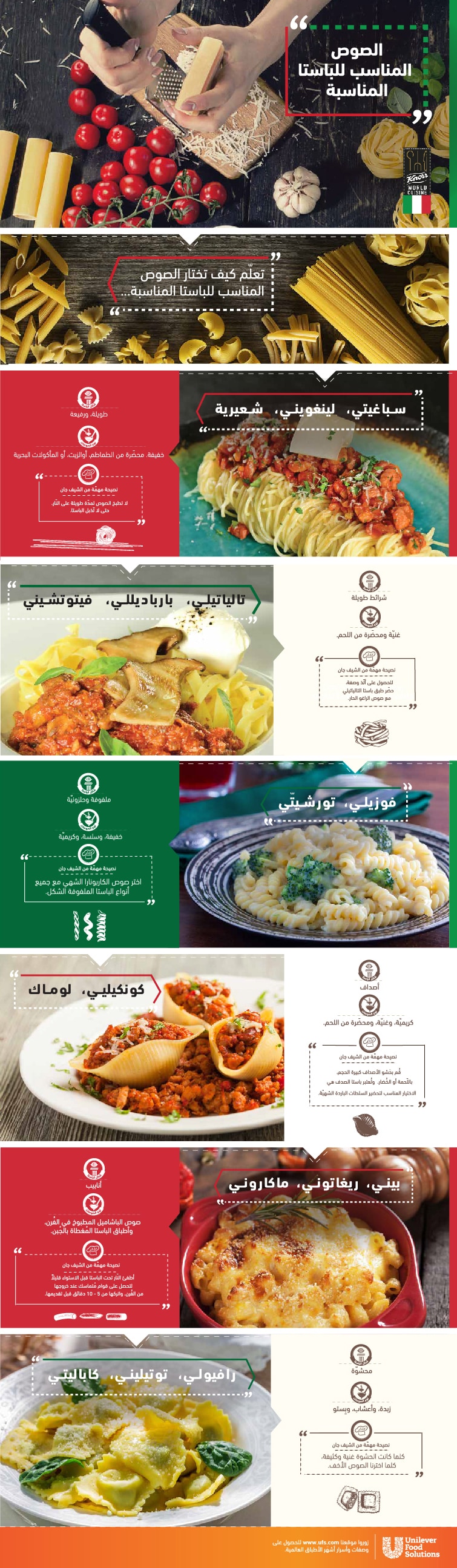 الباستا هي الطبق الرئيسي في المطبخ الإيطالي، وهناك أنواع كثيرة من الباستا، تختلف في الشكل والطول، والسُّمك. ولتحصل على طبق باستا لذيذ، يجب أن تختار الصوص الذي يتناغم مع نوع الباستا الذي تُحضّرها.