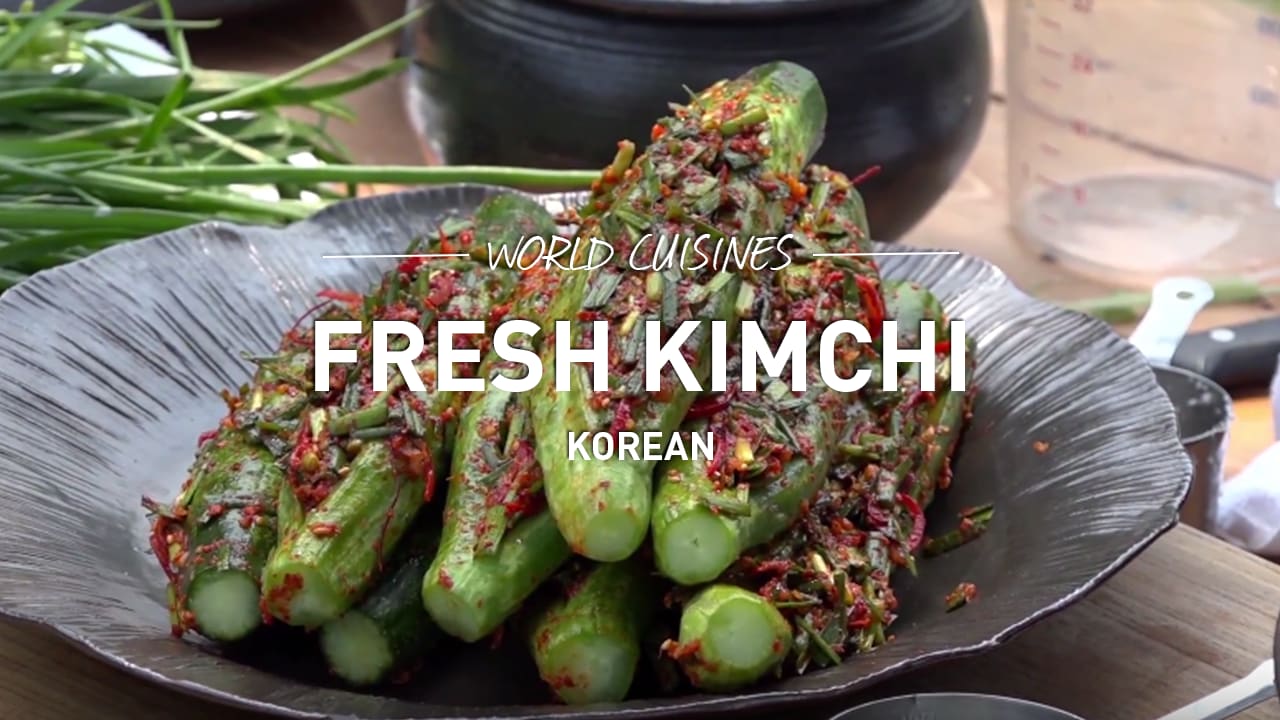للكيمتشي طعم مميز وذلك نتيجة للمكونات الغنية بالنكهة وعملية التخمير التي تتحوّل فيها الخضروات المستخدمة إلى أطباق استثنائية مختلفة. يعتبر كيمتشي الخيار الطازج واحداً من أشهر أنواع الكيمتشي الذي يوجد منه المئات، واليوم اخترنا وصفة منعشة تتلاءم مع شهور الصيف وحرارة الطقس. يحتوي كيمتشي مزيجاً من الخيار على الثوم المعمر المقطع، ورقائق الفلفل الأحمر، وصوص الأنشوفة، والثوم المفروم، وعصيدة الأرز، والروبيان المفروم، وحبوب السمسم المحمصة. ويتم حشو كل هذه المكونات في الخيار المخلّل.