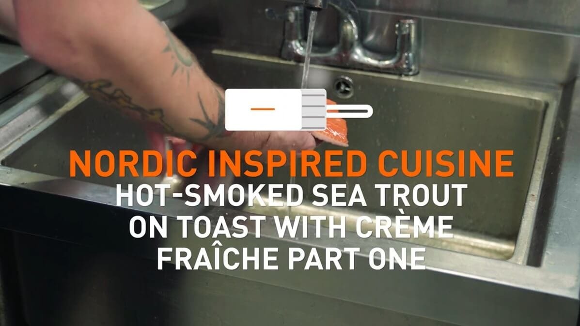 Watch part 2 to perfect the assembly of this Norwegian inspired sandwich. Watch as creme fraiche is paired with an assortment of pickled vegetables and ripples of smoked trout.
