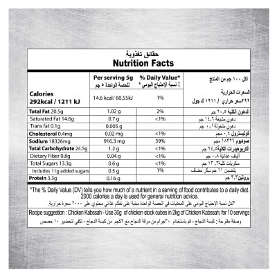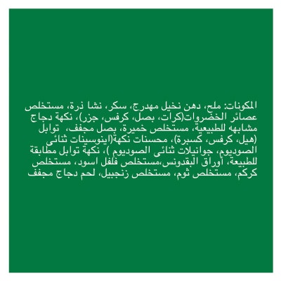 ملح، دهون نخيل مهدرجة، سكر، نشا ذرة، مركز عصير خضروات (كراث، بصل، كرفس، جزر)، نكهة دجاج مطابقة للطبيعة، مستخلص خميرة، بصل مجفف، توابل (هيل، كرفس وكزبرة)، محسنات طعم (دايصوديوم أينوسينات، دايصوديوم جوانيلات)، نكهة توابل مطابقة للطبيعة، أوراق بقدونس، مستخلص فلفل أسود، مستخلص كركم، مستخلص ثوم، مستخلص زنجبيل، لحم دجاج مجفف