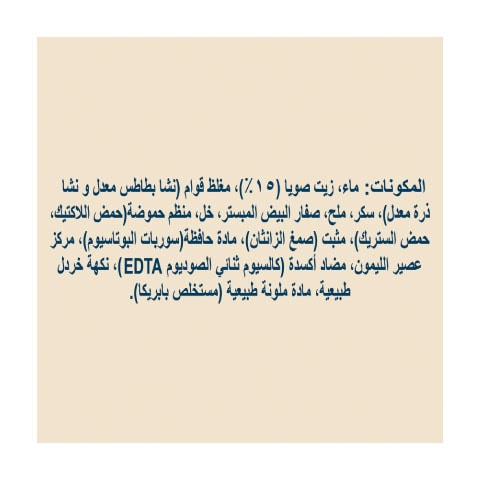 ماء، زيت نباتي مصفى (زيت فول الصويا)، نشاء ذرة معدل، صفار بيض مبستر، خل، سكر، ملح، مثخن (صمغ الزنثان إي ٤١٥)، نكهة خردل مطابقة للطبيعة، منظم حموضة (حمض اللاكتيك إي ٢١٠)، مادة حافظة (حمض السوربيك إي ٢٠٠)، عصير ليمون مركز، مضاد للأكسدة (ثنائي صوديوم الكالسيوم إي دي تي آي إي ٣٨٥)