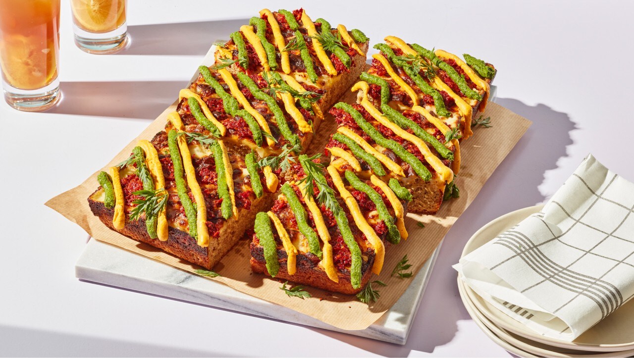 One of the global top dishes with a high-fiber focaccia base, topped with a pesto made with carrot tops, carrot aioli, fermented garlic, and a kick of spice from Nduja.