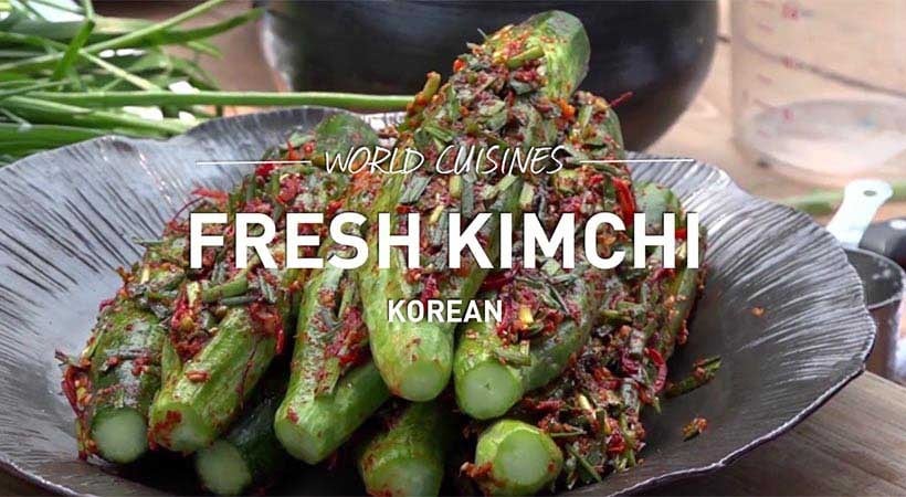 Kimchi uses the process of fermentation to transform vegetables into unique variations. Fresh cucumber kimchi is one of hundreds of different types of Korean kimchi. This one is best eaten in the summer months. It uses a mixture of chopped chives, red pepper flakes, anchovy sauce, minced garlic, rice porridge, minced shrimp and toasted sesame seeds, stuffed into pickled cucumbers.