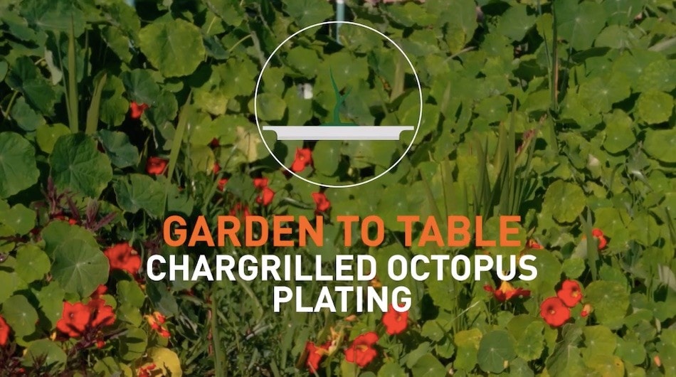 Part 2 plates all the components together for a chargrilled octopus dish with a twist. Chutney, salsa, cracker shards and broad bean shoots top this fresh garden dish.